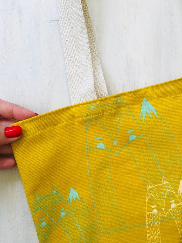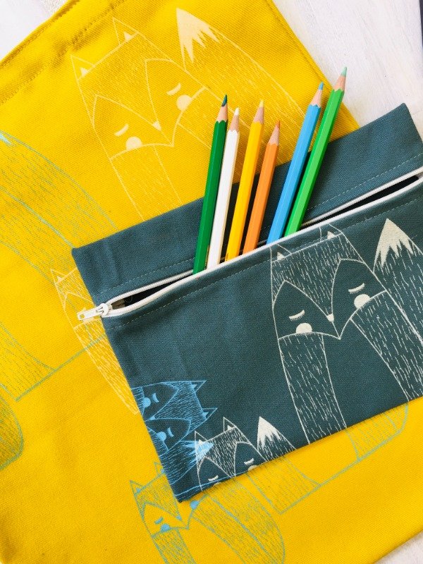 Tote estampado CON ZORRITOS EN VARIOS COLORES en tela de gabardina amarilla+ cartuchera de gabardina verde seco. Tiene un bolsillo interno para guardar lo que quieras, como podés ver en la foto más arriba. La medida del tote es de 35 cm de ancho y 40 cm de alto. Lo podès llenar de cuadernos tipo universitarios ;) como para que te des una idea del tamaño.