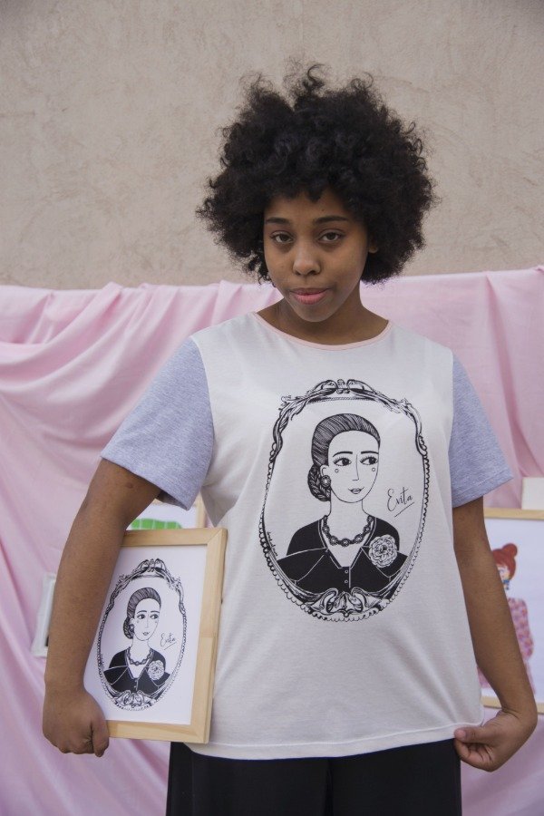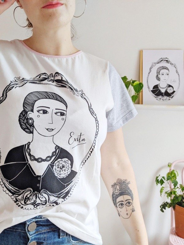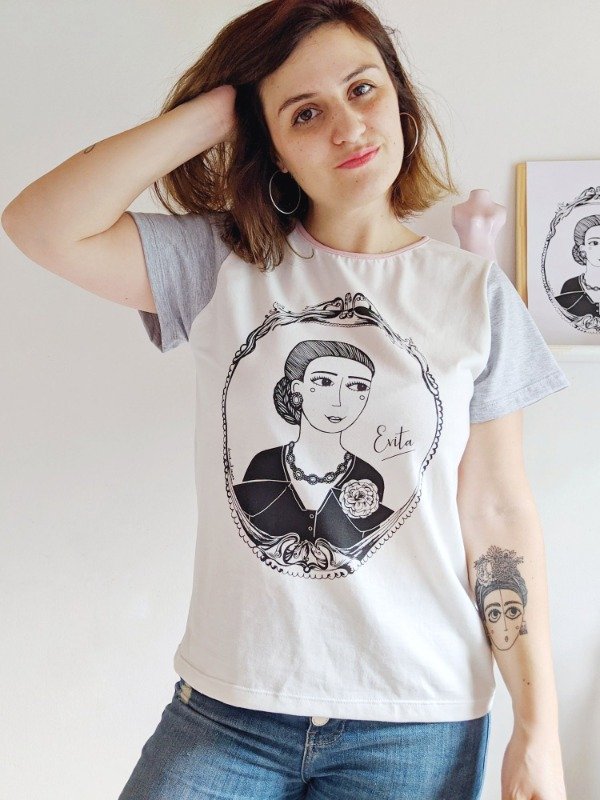 Remera EVITA con cuello redondo color rosa pálido, frente y espalda color tiza y mangas color gris melange. La estampa es color negro.