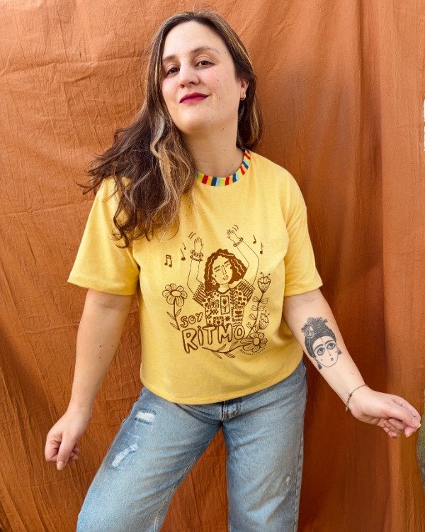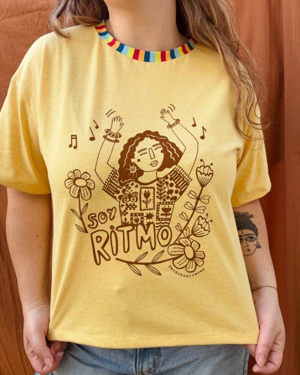 Remerón SOY RITMO color amarillo claro . El escote es redondo básico con rayas multicolores. Las mangas son cortas