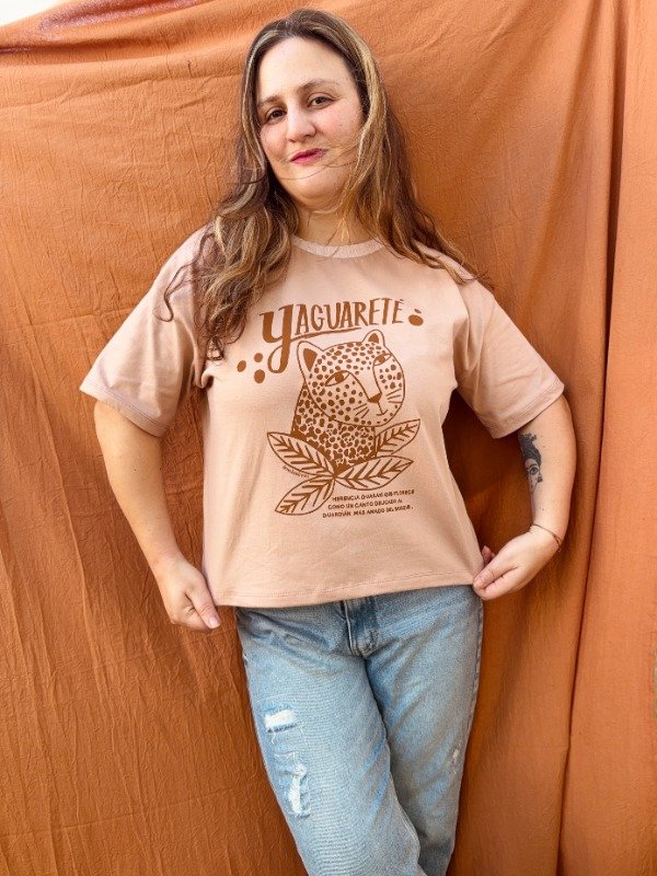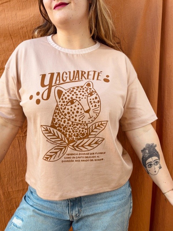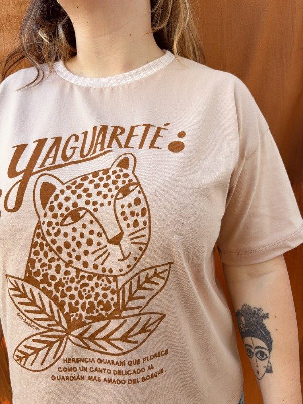 Remerón Yaguareté color avellana . El escote es redondo básico con lurex color rosa claro. Las mangas son cortas